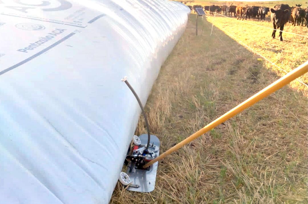 Funcionamiento: Las bandas generan una descarga eléctrica no letal que repele a los animales que intentan acercarse al silo bolsa.